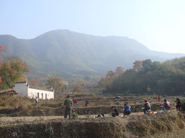 第二天清晨,我們坐上大客車(chē)開(kāi)始期待中的旅程。出了屯溪不久就行駛在蜿蜒曲折的山間公路上,往往你覺(jué)得公路消失在前方的山腹里,一個(gè)90度的急轉(zhuǎn)彎又柳暗花明了。一個(gè)多小時(shí)后,客車(chē)徐徐的轉(zhuǎn)過(guò)一道彎,黟縣的同學(xué)說(shuō)塔川到了,于是我們都昂起頭來(lái)到處張望,首先映入眼簾的不是風(fēng)景,而是公路邊架起的無(wú)數(shù)只“長(zhǎng)槍短炮”,那場(chǎng)面是絕對(duì)的震撼。哦,不,這本身就是一道風(fēng)景,一道能充分詮釋塔川之美的風(fēng)景。我順著那些鏡頭對(duì)著的方向看去,一大團(tuán)一大團(tuán)的色彩點(diǎn)綴在山谷中,有橘紅、有金黃、有絮白,似錦簇、似綢緞、似云霞,粉墻黛瓦的古民居點(diǎn)綴其中,青青淡淡的炊煙裊裊升騰,好一幅蕩氣回腸的秋色長(zhǎng)卷!